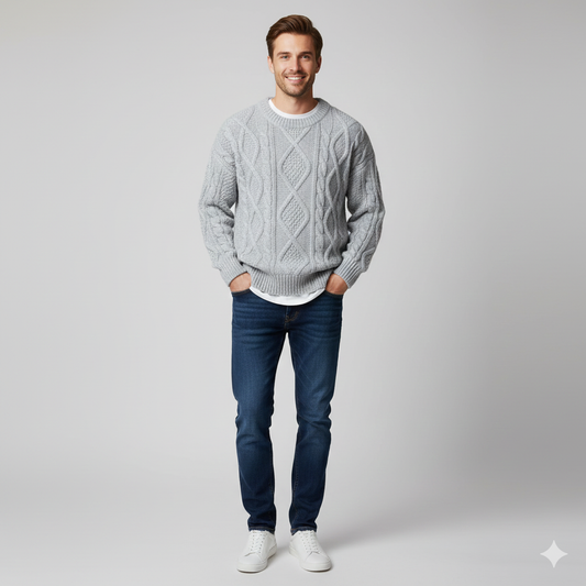 Men’s Premium Light Grey Knit Sweater - Ultra-Soft Cotton Blend, Ribbed Crew Neck, Modern Casual Pullover for Autumn & Winter